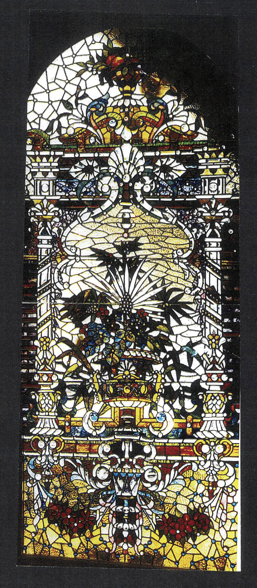 Etienne. This color graded window contained around 300 bevels, many, if not most, with notched brilliant cut work and a honeycomb design in the 1/2 inch thick center bevels.
